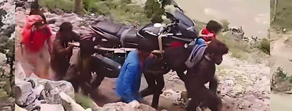 मोटरसाइकल चालक नन्द सिंहले नेपालगन्जबाट सलीसल्ला हुँदै सर्केगाड गाउँपालिकाको स्याल्तडीसम्म गाडीमा मोटरसाइकल ल्याए । त्यस यताको करिब पाँच किलोमिटर क्षेत्रमा मानिसलाई बोकाएर मोटरसाइकल ल्याउनुपर्ने बाध्यता छ ।